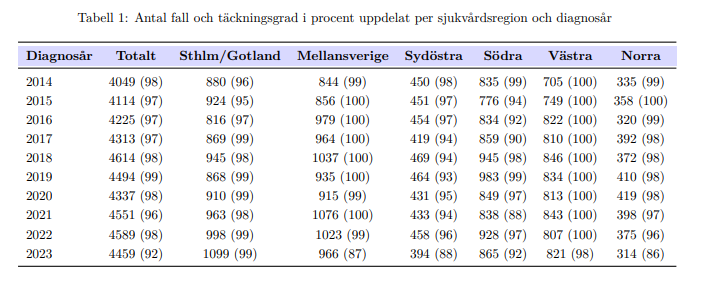 Andelar (%) - Flera av figurerna i rapporten presenteras andelar som oftast summeras till 100%. Då är det viktigt vid tolkningen att vara medveten om att flera av dessa staplar bygger på en väldigt liten population (t.ex. grafer uppdelat på region och kalenderår vid diagnos). För att förstå bakgrundspopulationen, vänligen se Appendix.